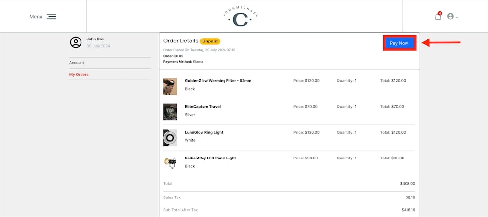 Click on any order that has an unpaid status. You will be led to the Order Details page. From there, simply click on the “Pay Now” button.