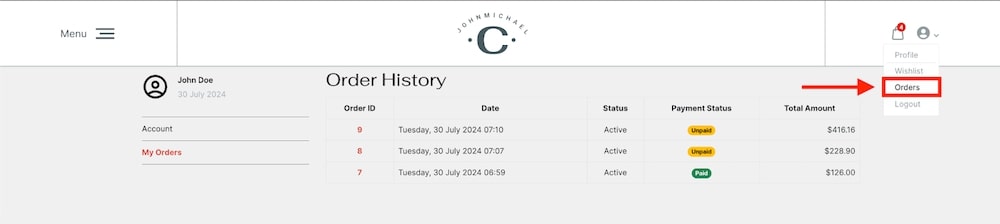 To access this feature, you need to log in to your site first. From the profile icon in the top right, you can access the Orders page. Here, you will find the list of active orders and their respective payment statuses.