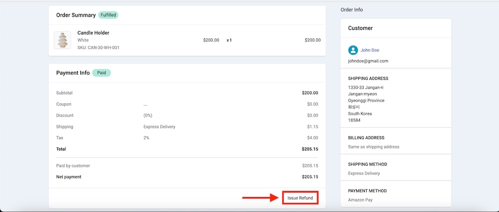 From there, you will be presented with the Order page. Now, click on "Issue Refund".