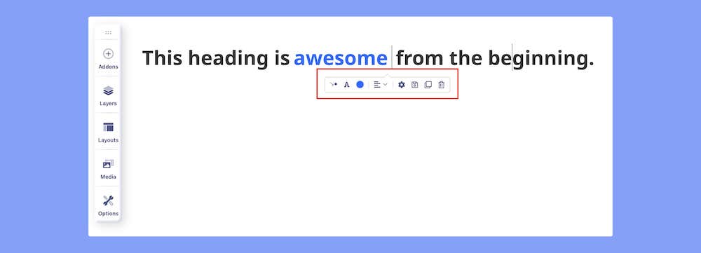 For every added addon, when you click on it an inline editor appears. There you will find the tools for accessing the styling options of the addon. The options are addon specific and we have in-depth documentation for every addon in the Addons section.