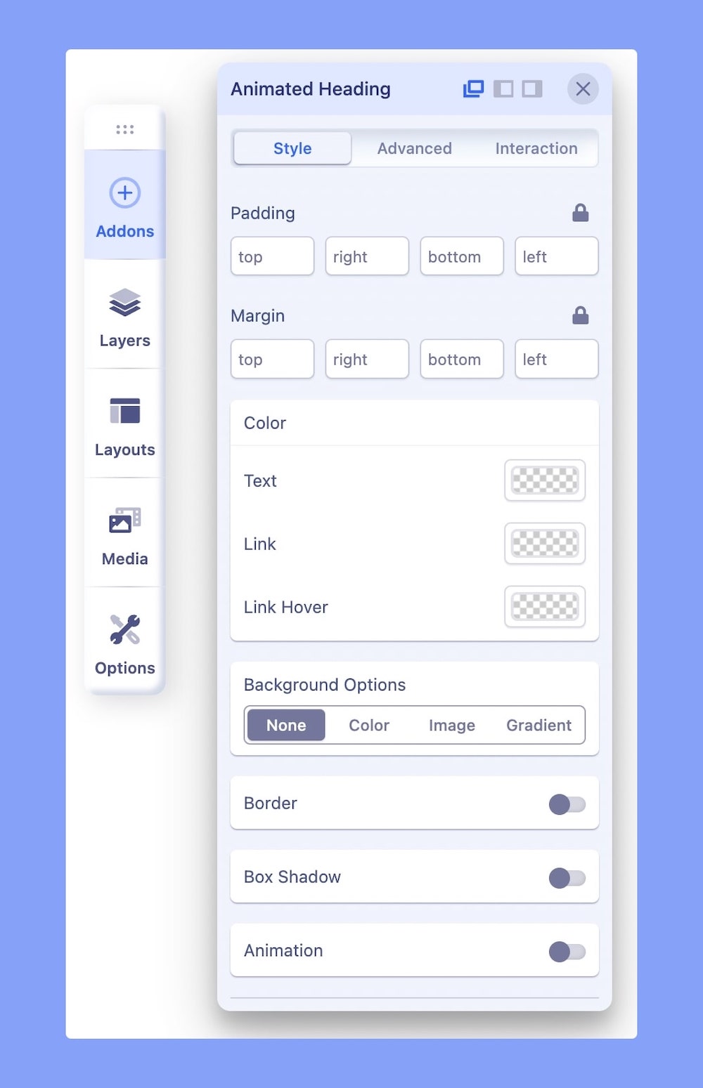 When you click on the settings icon this will open the Addon editing option to add styling and customization. Again, the addon editor is addon-specific which we have covered in depth in the Addons documentation. But some of the options apply to all addons which we will cover in this section.