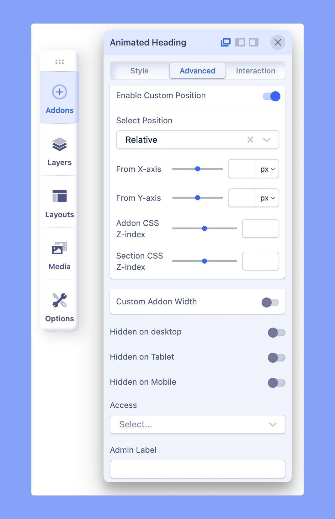 From X-axis: You can move the addon horizontally, positive values refer to the right and negative refers to the left position. The feature is responsive which means you can set different values for each device type.