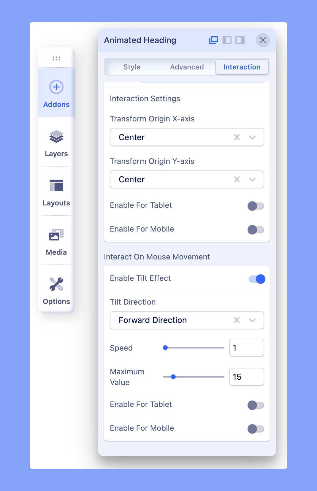 Maximum Value: Set a maximum value, i.e up to which degree the addon will tilt on hover.