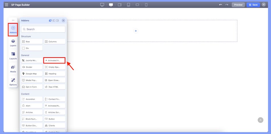 Create a new Row or Column where you want to insert your animated heading. Then navigate to the SP Page Builder sidebar and choose Addons > Animated Heading from the General section. Simply drag the addon and place it in the row or column according to preference.