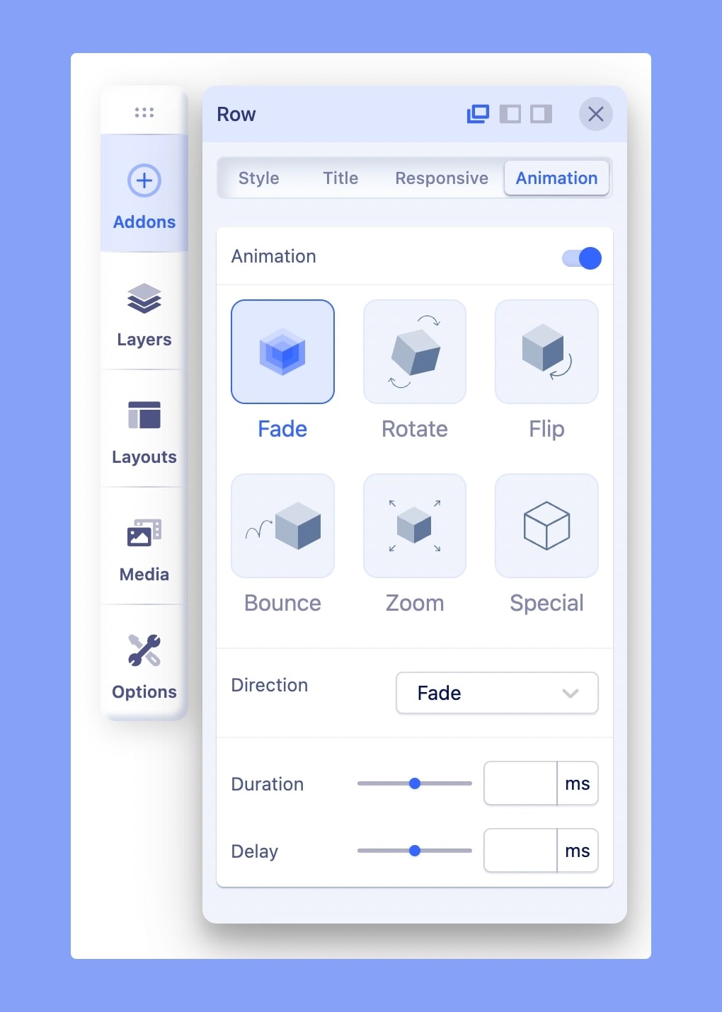 The Animations feature lets you animate your Addons, Rows (Sections), and Columns. This way, as your website visitor scrolls down the page, the elements appear with an entrance animation. You can choose: