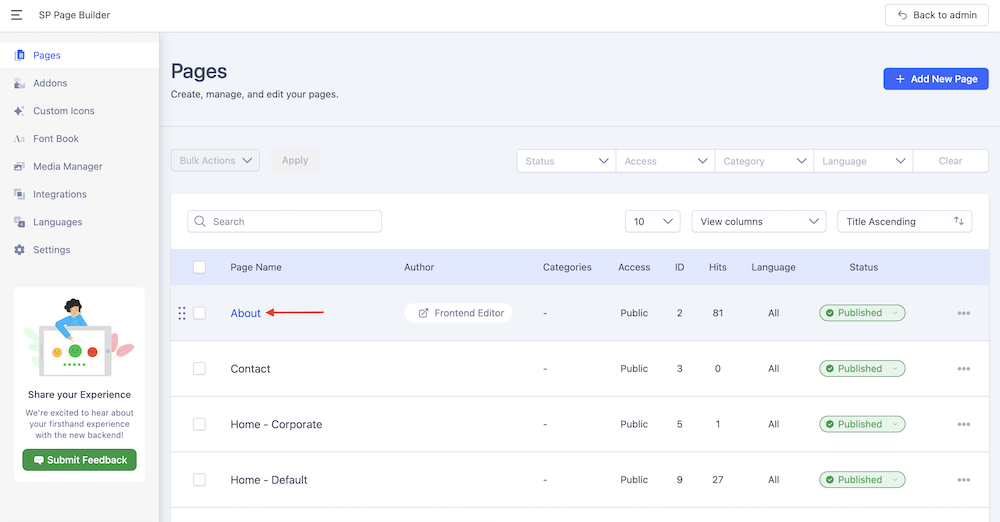 Click on any existing page to access the backend editor of that page. Or you can hit “+ New Page” to create a new page. Once you create a new page, it will directly take you to the backend editor of SP Page Builder.