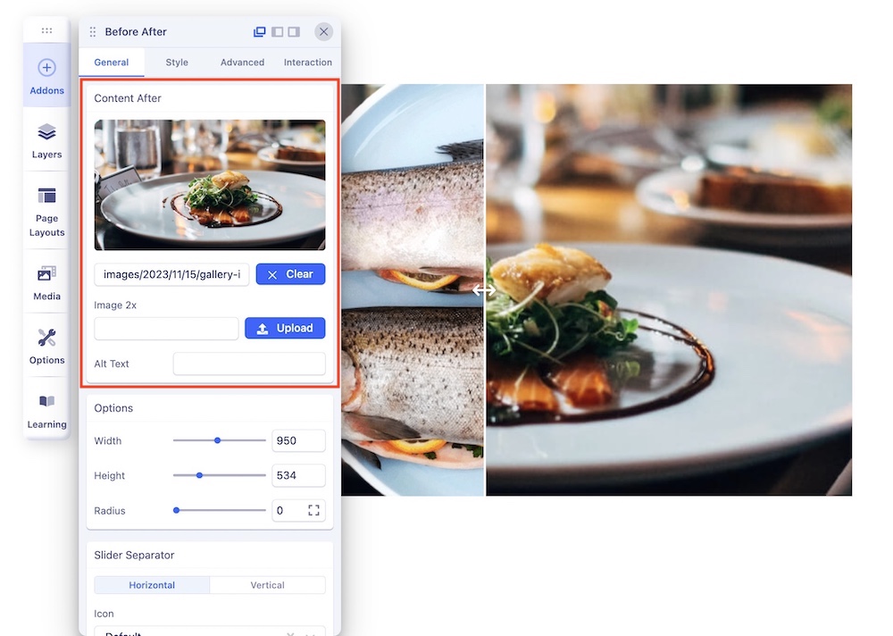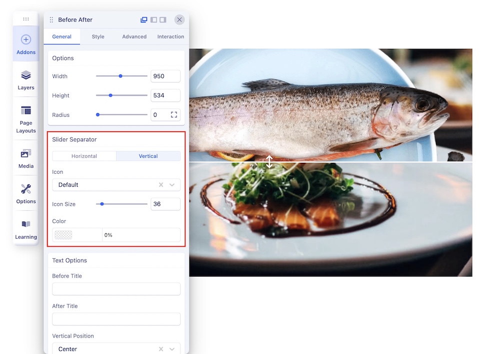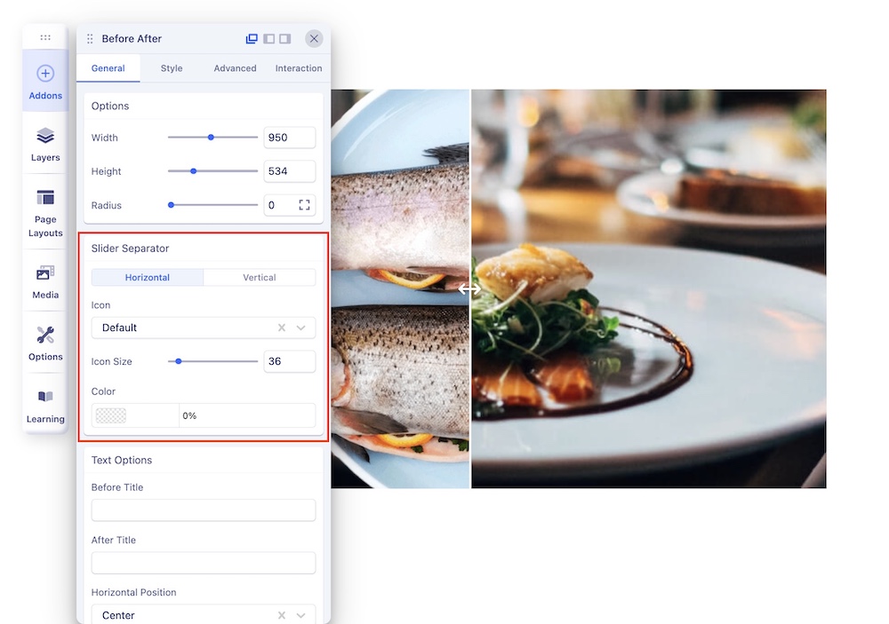 The slider separator is the icon positioned at the center of the addon to divide the before and after images allowing users to slide it to reveal the before-after changes. There are 2 ways you can display the slider separator: Horizontal and Vertical.