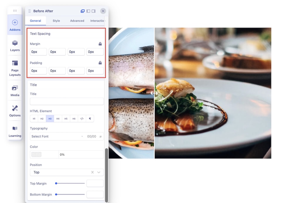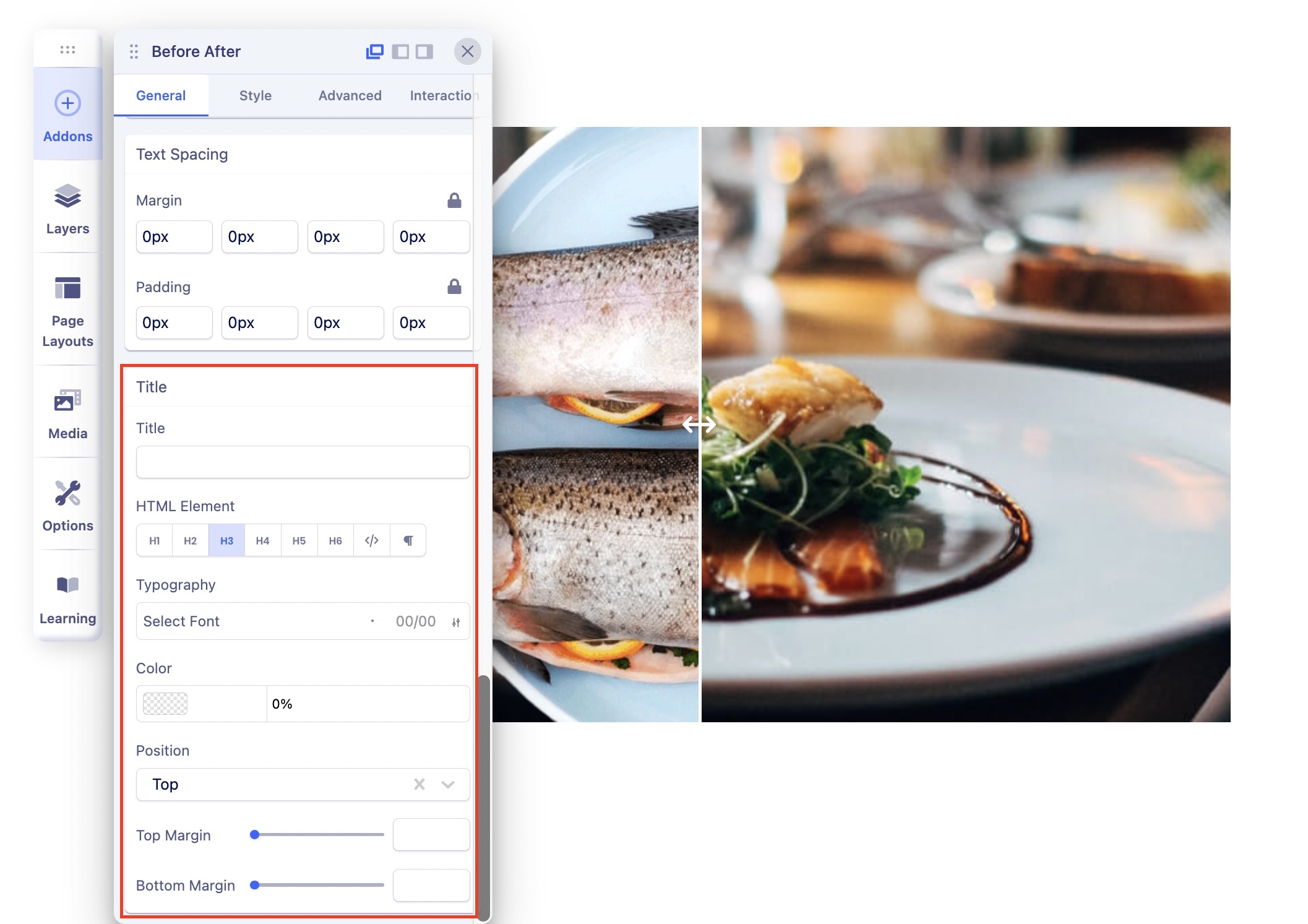 Typography: Customize the Before After Title’s font, font size, line height, letter space, style, and weight.