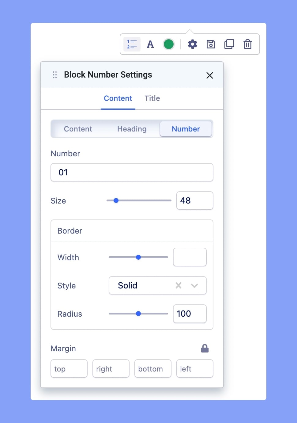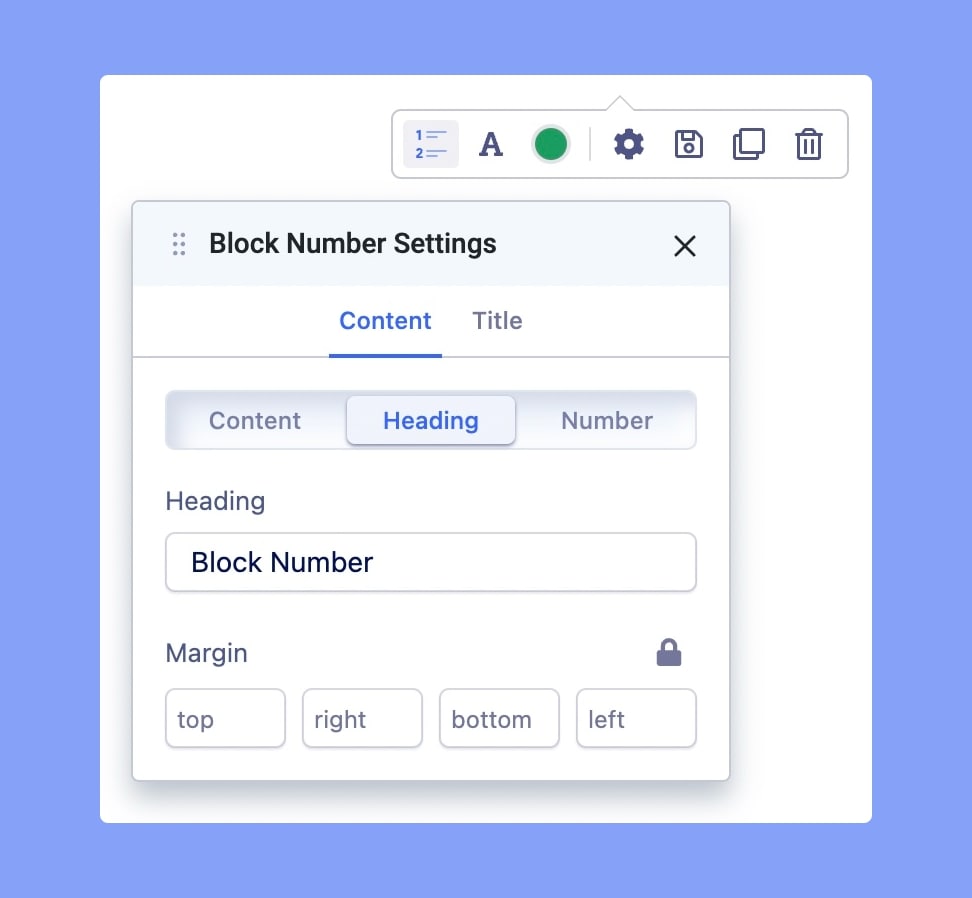 Text: Block number always comes with some content or text elements. Use this text field to add the content you want to display the block number.