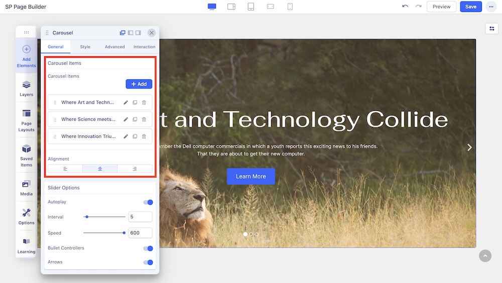 You can add a Carousel addon to your page from the SP Page Builder sidebar. Simply drag the addon from the Addons panel and drop it on the section of the page where you want to add a Carousel addon.