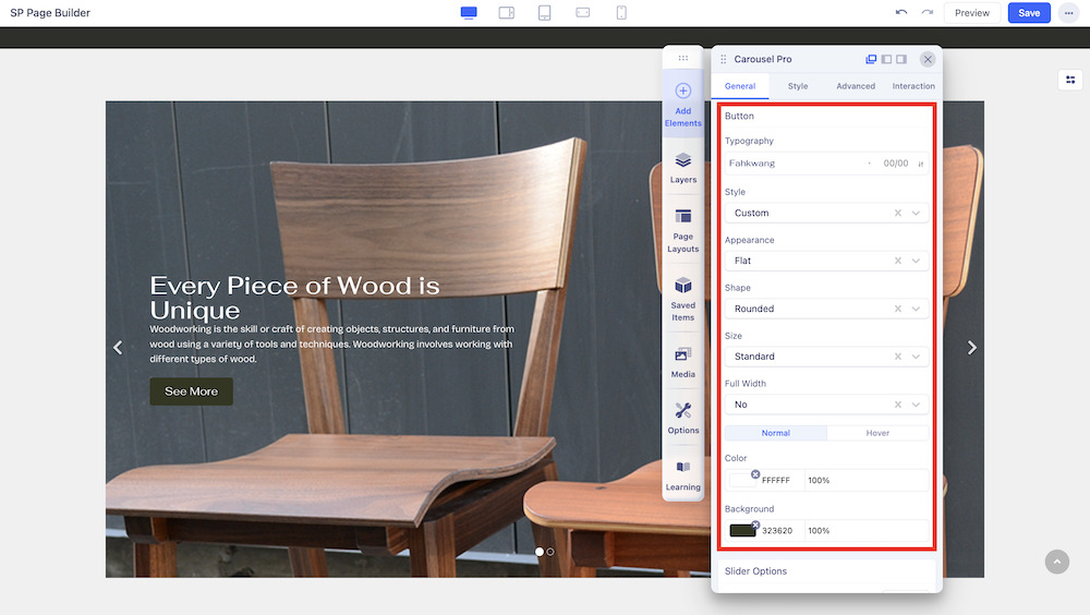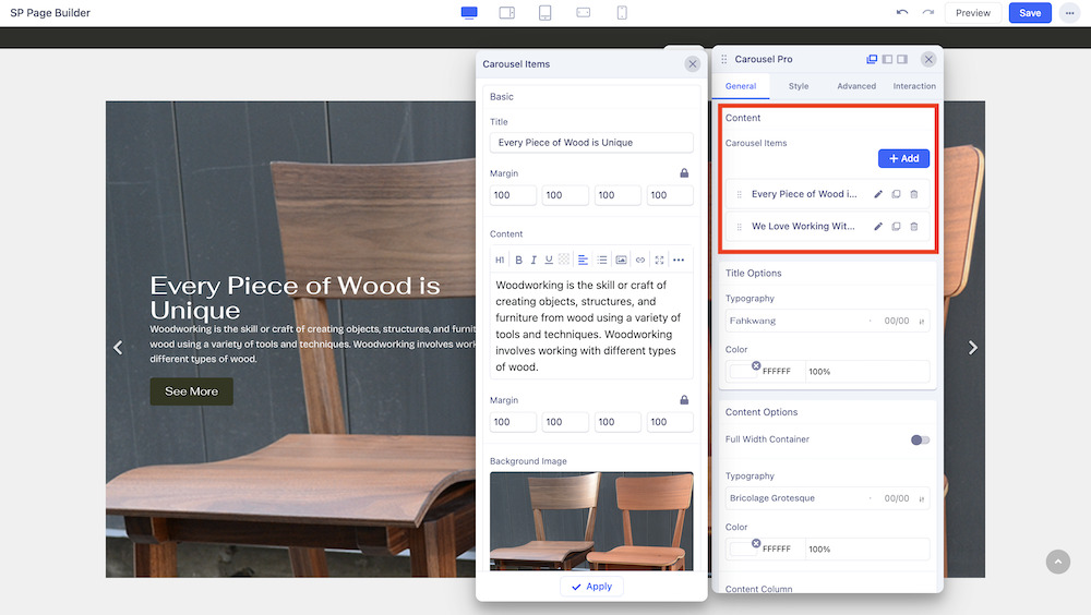 In the General tab, you will first get the option to add items to the Carousel and edit them. For each item, you can edit the title, and content, add background images and overlaying images, as well as buttons and much more.