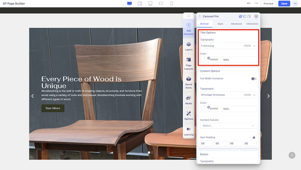 You can adjust the typography and color of the title with Title Options.