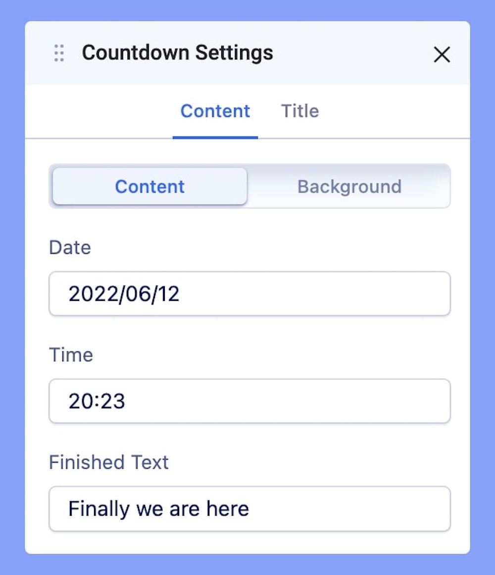The Content tab lets you access the fundamental settings of your Countdown timer. Edit your timer’s most basic settings like date, time, and Finished Text using the Content tab.