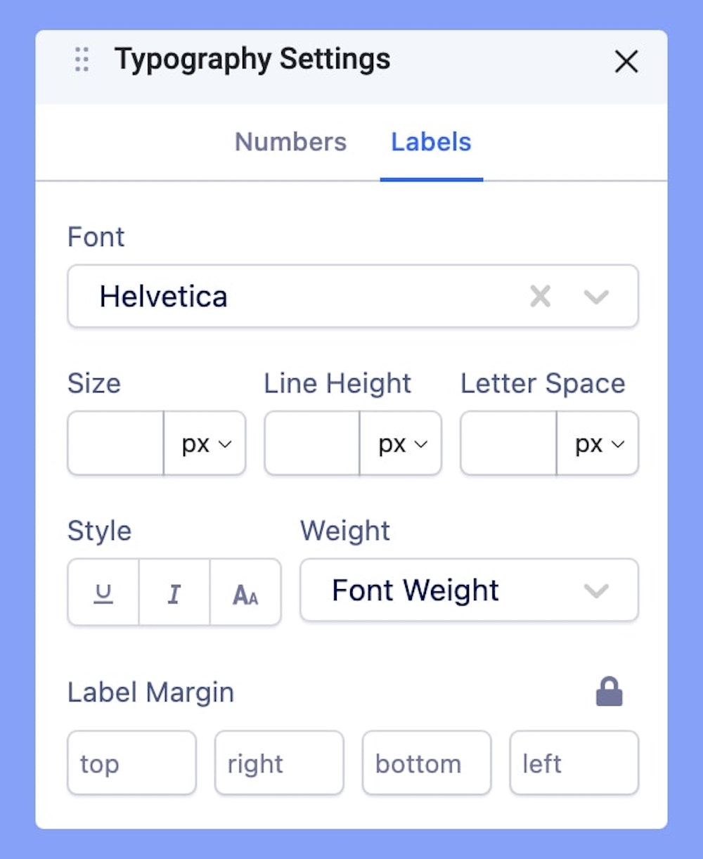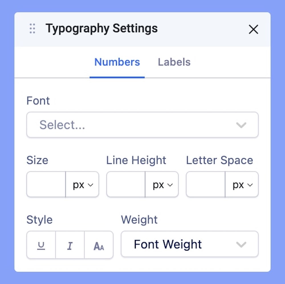 The Numbers tab lets you edit the displayed numbers in your countdown timer and includes fields to edit the Font style, Size, Line Height, Letter Space Style, and Weight. Etc. Learn more about typography settings here.