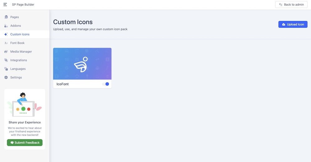 Go to SP Page Builder Dashboard and select Custom Icons, then click Upload Your icon.
