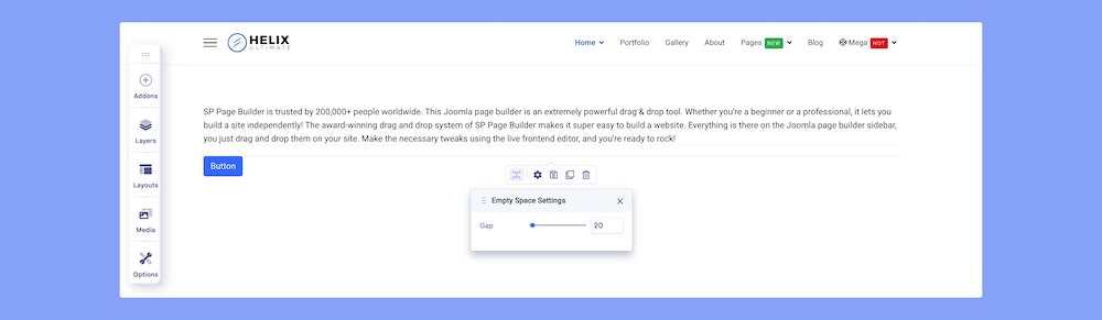 Now that the addon’s been added, click on the Empty Space icon on the inline editor to open its settings.