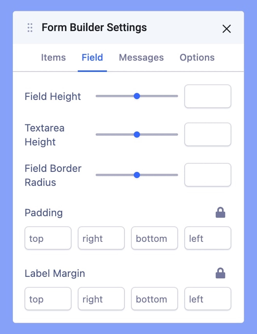 Field Border Radius: By increasing the Field Border Radius, you can transition the typically rectangular shape of form items into a more rounded and aesthetically pleasing design.