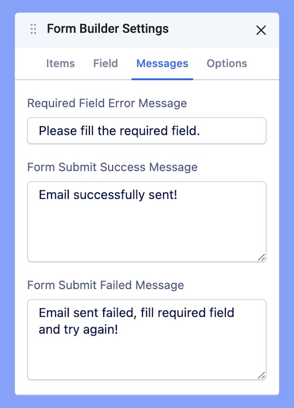 Form Submit Failed Message: Tailor the text for situations when a form submission fails. This customized message will only be visible when a form fails to submit correctly.