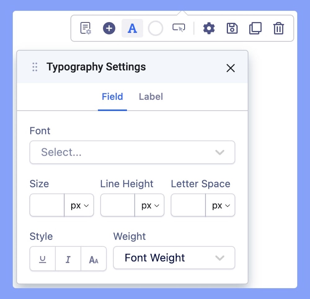The Typography Settings lets you edit the Field text and the Label text to fit your preference. Adjust your font types, Size, Line Height, Letter Space, Style, and Weight for your Form Builder Fields and Label texts. Learn more about Typography.