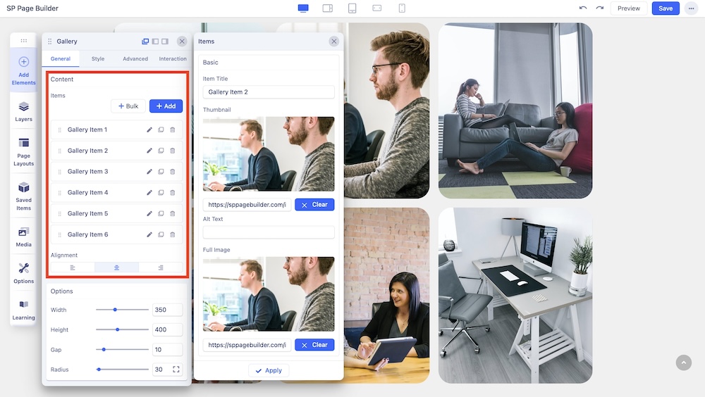 SP Page Builder Gallery Addon is designed for a gorgeous-looking image gallery output. You can add thumbnails for your images and upon clicking the thumbnails the image pops up.