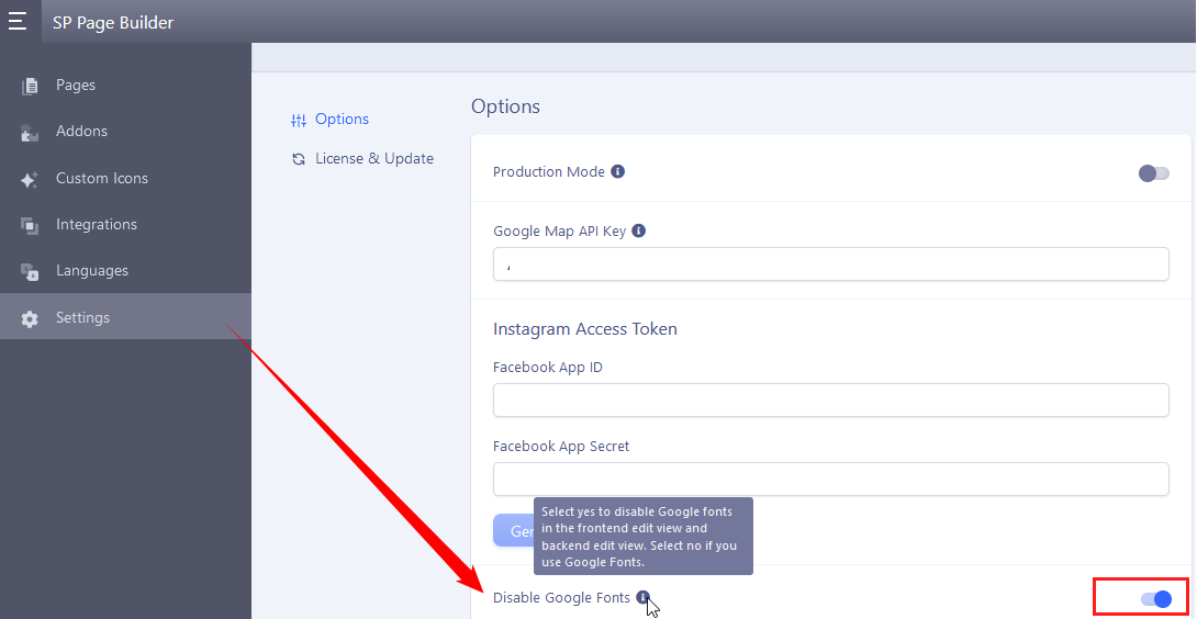 Inside SP Page Builder > Settings, you have a switcher that allows you to disable Google Fonts from use. That option will allow you to choose whether you want Google Fonts (and its HTML code) to load or not.