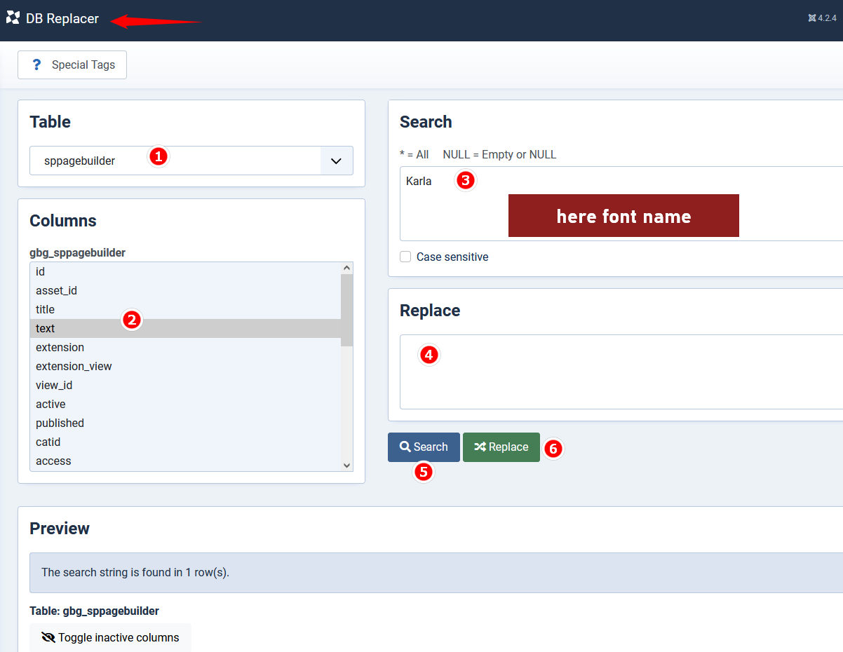 You can also delete font names from a database, for that task, you can use the Free version of DB Replacer (from RegularLabs). In the below example, we searched only inside sppagebuilder Table. An example "Karla" font name. In your case copy the font name from the HTML name and use it inside the Search field and replace it with empty space. Follow 1-6 steps from the screenshot.