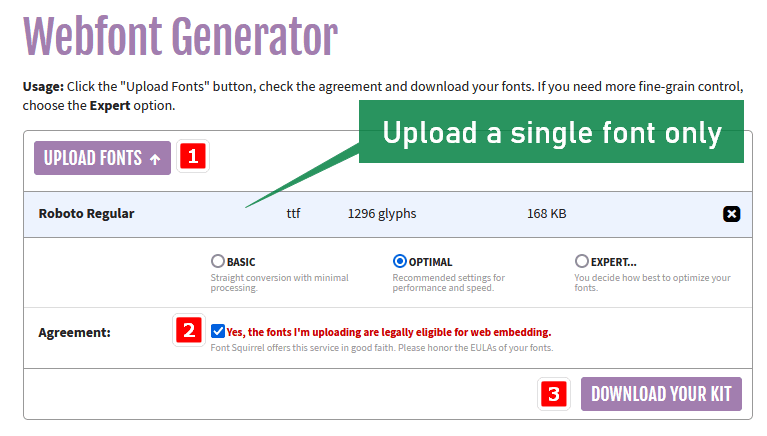 Click the Upload Fonts button to select your .TTF or .OTF font file. It must be a single font only. Regular and Bold are two different fonts.
