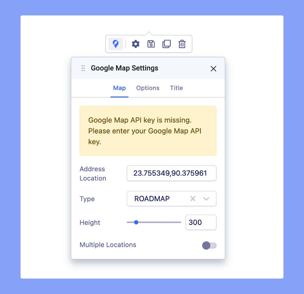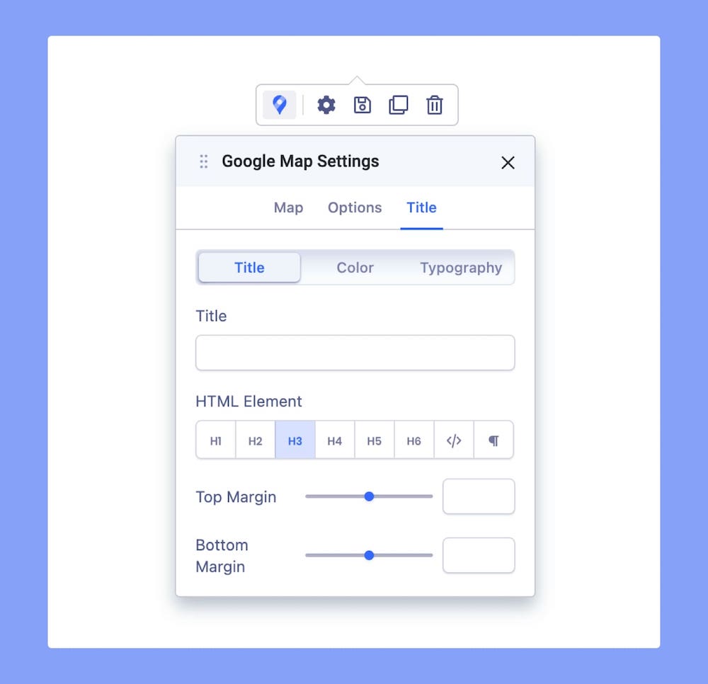 You can also add a Title to your Google Map. Go to the Title tab on Google Map Settings to access this option.