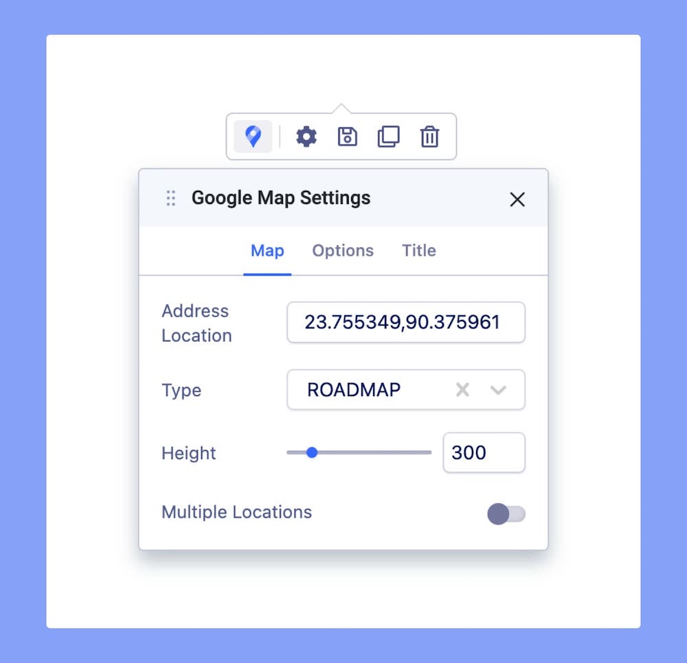 Now that you have added your location(s), it’s time to adapt the Map Controls to your tastes. To do this, head over to the Google Maps inline editor and open Google Map Settings. On the Options tab, you will find the following features: