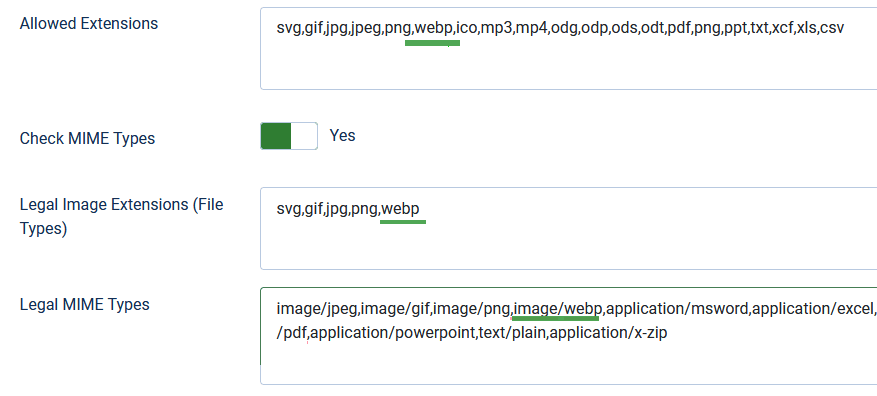 By default, Joomla Media may not support .webp files and during file upload, you may see "Unable to upload file". Hopefully can add .webp support for pages (and addons, rows), and articles easily. Go to the Media global configuration (Content > Media > Options).