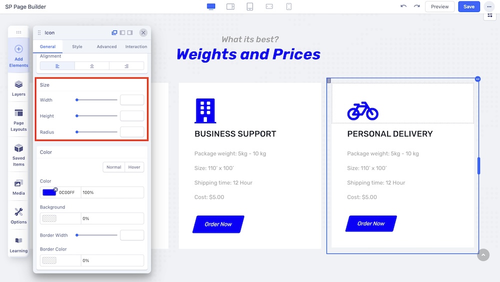Width: Use this field to add the width of the border. The width you declare will work as the horizontal space for the border of the icon.