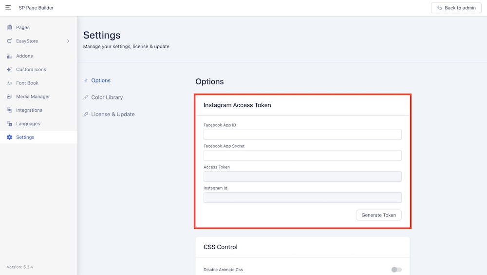Head to the SP Page Dashboard and then Settings. In the Options tab, you will find fields to paste the App ID and App Secret. Paste the App ID and the App Secret accordingly, below that you will see a button that says Generate Token.