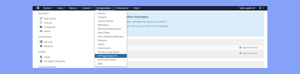 From the Dashboard, go to Components and select SP Page Builder.