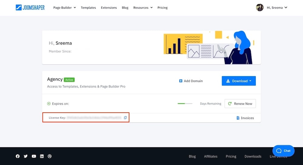 To instantly land on your JoomShaper user dashboard to get the license key, click on the Find My License Key option on the top right corner of the email address and license key fields. Once you land on the user dashboard you can copy the license key from here.