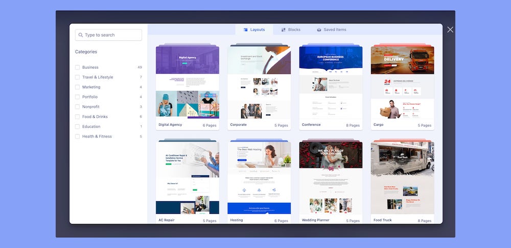 SP Page Builder has a plethora of layout bundles in every niche to speed up your development. You can filter the layout bundles by category or search for a specific one in the search field.