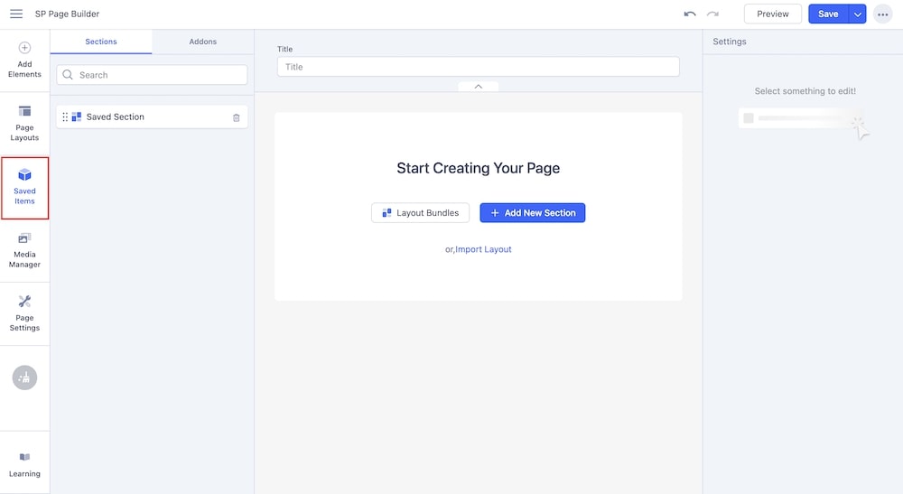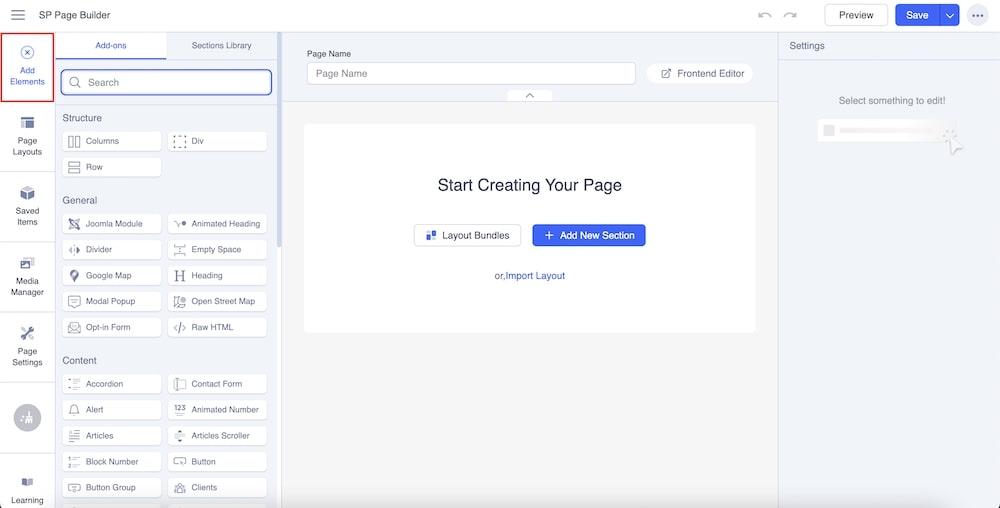 The editing interface of the backend editor comes with a Main Menu Bar that contains Add Elements, Page Layouts, Saved Items, Media Manager, Page Settings, Clipboard Cleaner, and Learnings. You can carry out all your major activities like adding SP Page Builder addons to your created sections, accessing existing layout bundles & previously saved items, etc from this main menu bar.