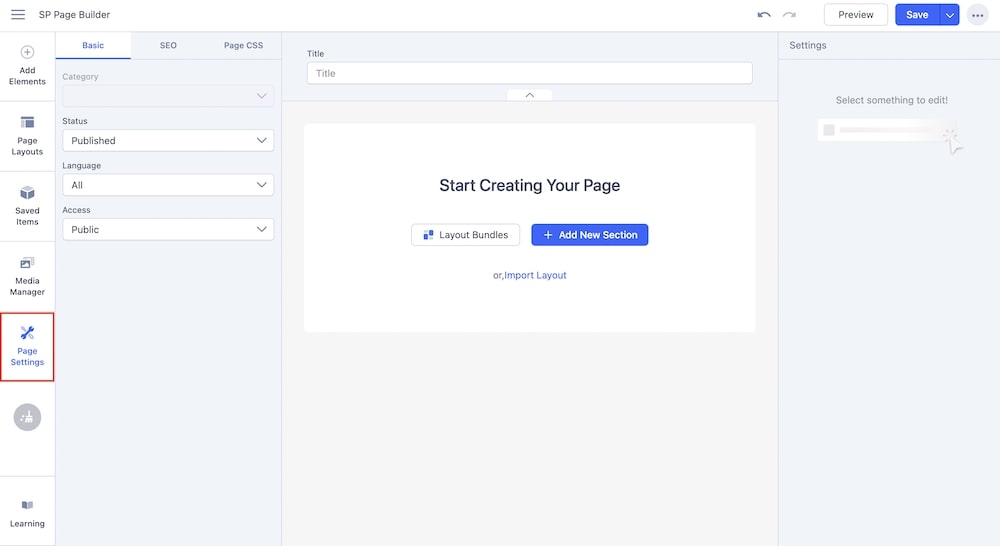 SP Page Builder’s Page Settings let you manage the page’s language, access level, page CSS, SEO settings, and more. The Basic, Page CSS, and SEO options have been arranged in 3 different tabs for a cleaner experience.