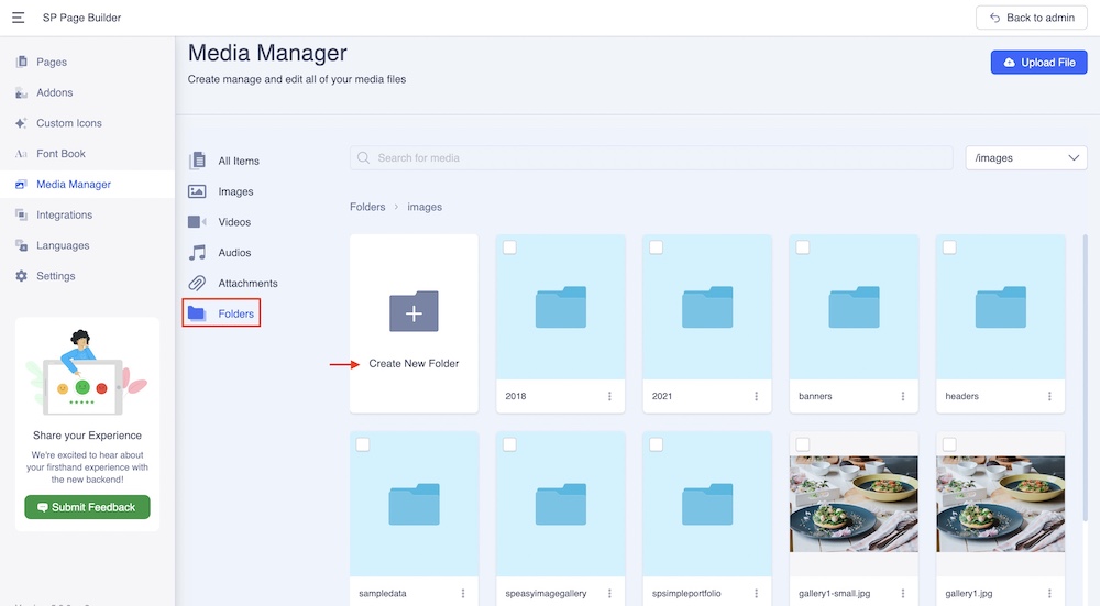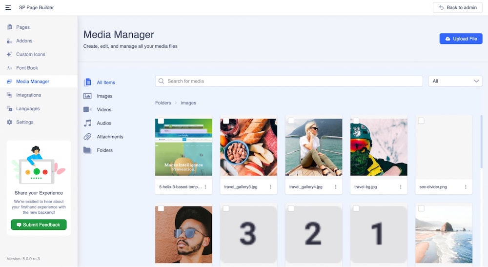 The SP Page Builder Media Manager lets you manage and control your media files with ease. You can access Media Manager from both the frontend editor and the backend editor.