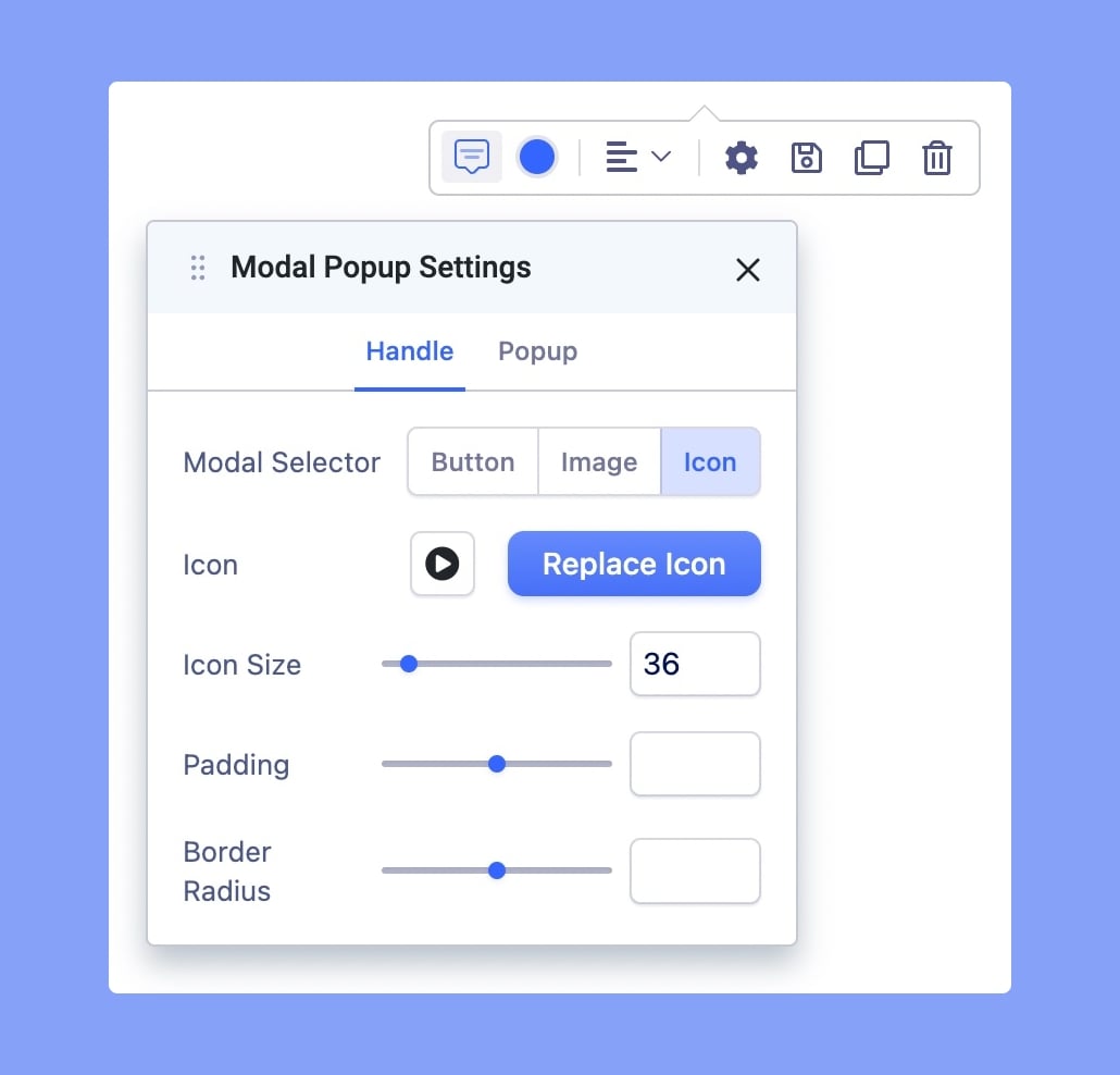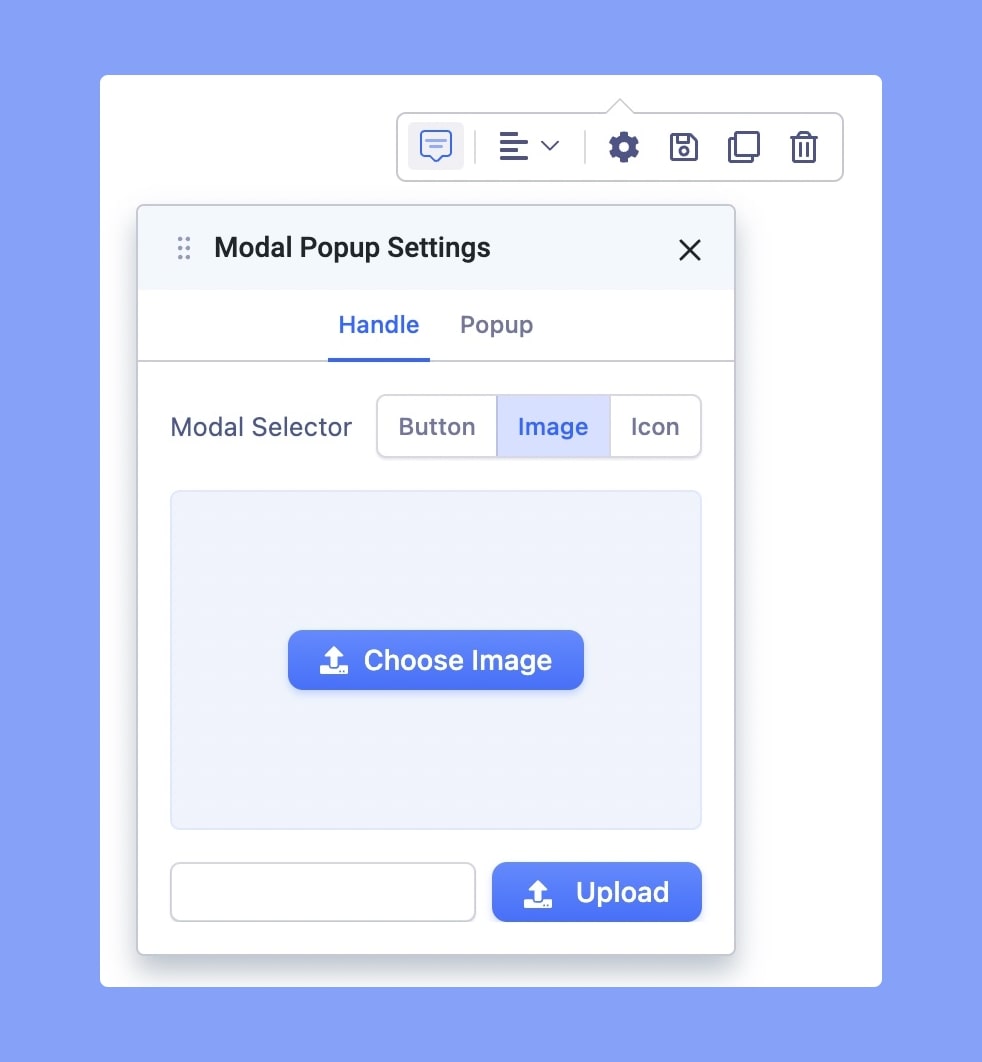 There are three types of modal selectors available in modal selectors—Button, Image, and Icon.