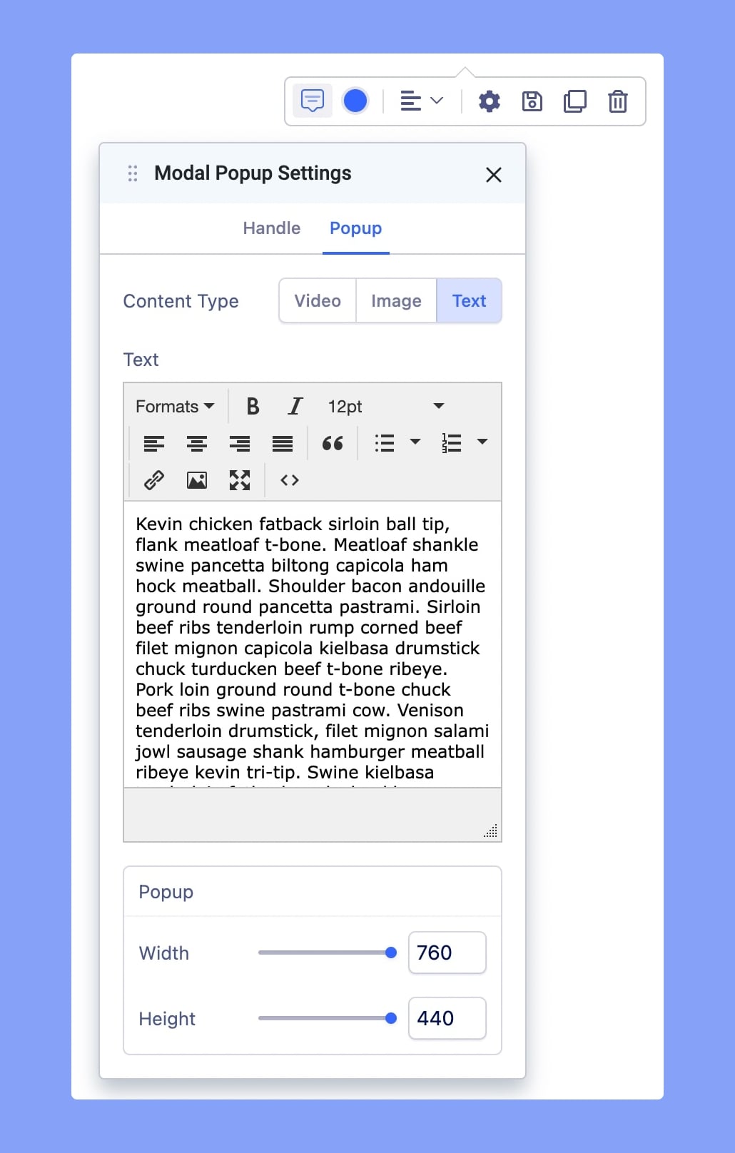 Popup Width: Set the modal popup width. The width will define the amount of space the modal is going to cover horizontally.