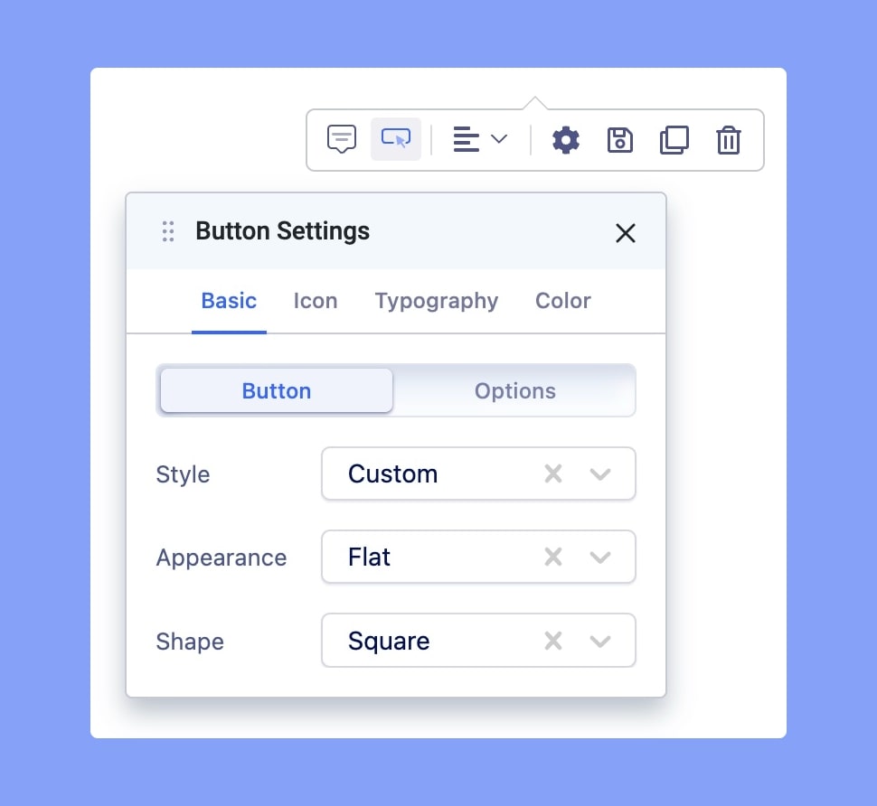 Basic: From the basic tab, you can select the Button Style, Appearance, and Button Shape.