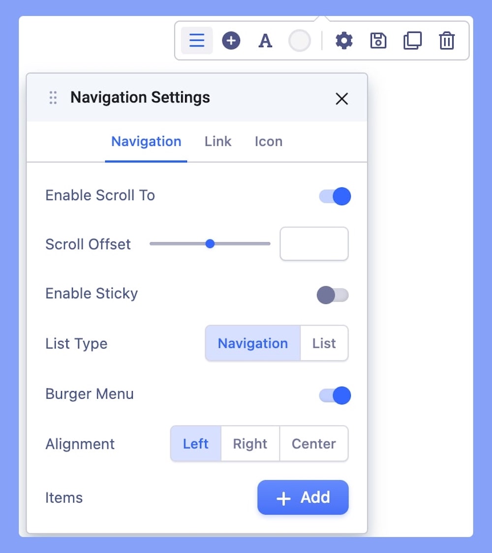 Alignment: Used to set the horizontal alignment of navigation links. You can choose: left or right or centered.