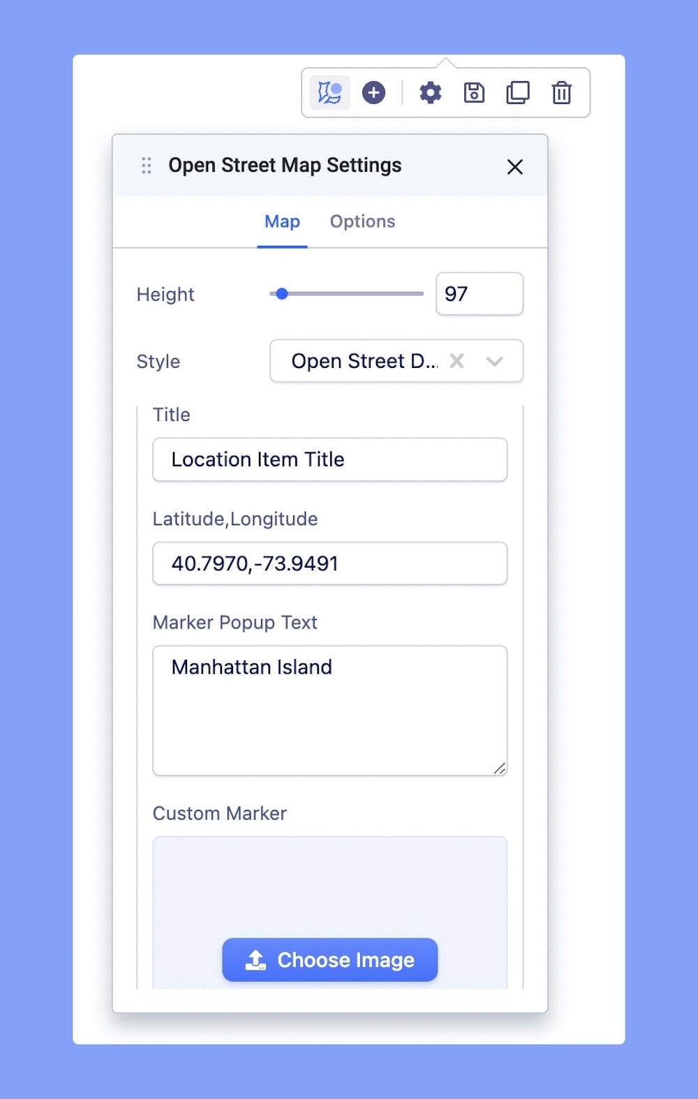 Custom Marker: A marker is a visual representation of a specific coordinate on a map. You can upload images here to use as a custom marker.