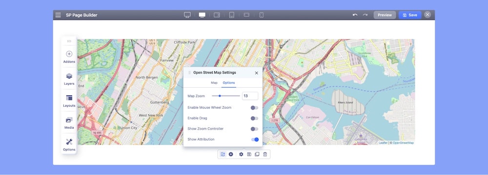 You can add the Open Street Map addon to your page from the SP Page Builder sidebar. Simply drag the addon from the Addons panel and drop it on the section of the page where you want to add the Open Street Map.