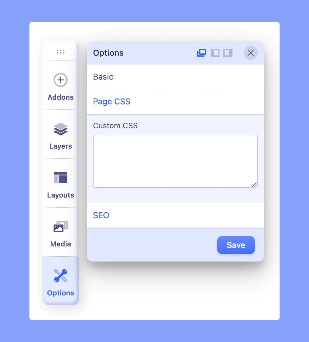 You can access Options from the frontend sidebar editor of SP Page Builder. When you open the Options tab, you’ll see the settings are categorized into three categories: