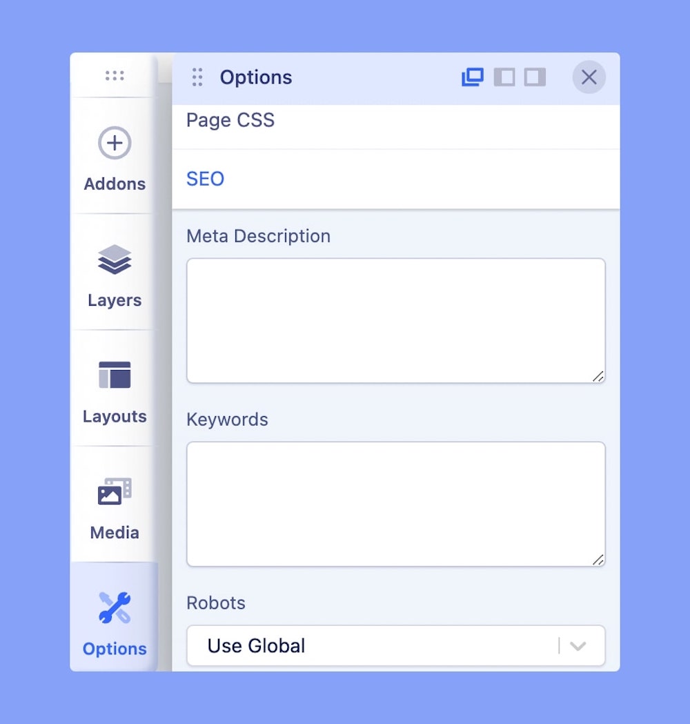 SP Page Builder’s page Options have a lot of handy settings that lets you manage the page’s language, access level, page CSS, SEO settings, and more.