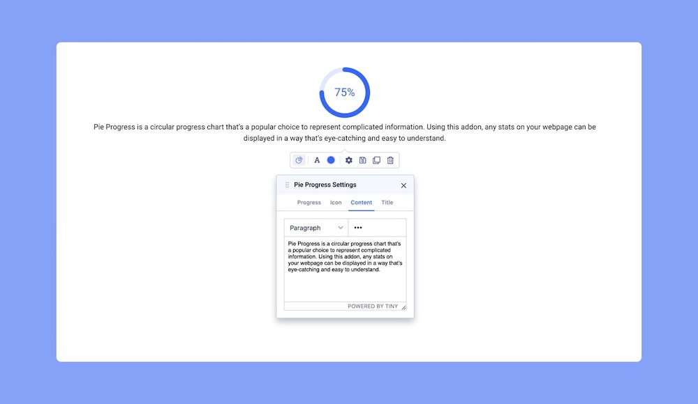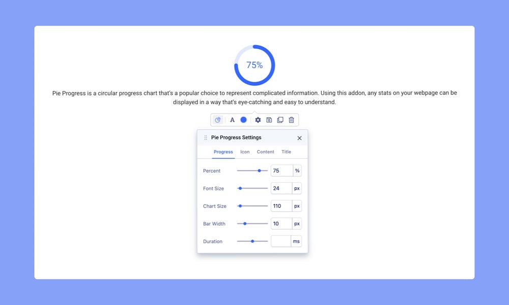 Now that you’ve added the Pie Progress, it’s time to customize it to make it your own. Click on the Pie Chart icon that’s on the inline editor. This will open up the Pie Progress Settings where you’ll find several options which we’ve gone through below.