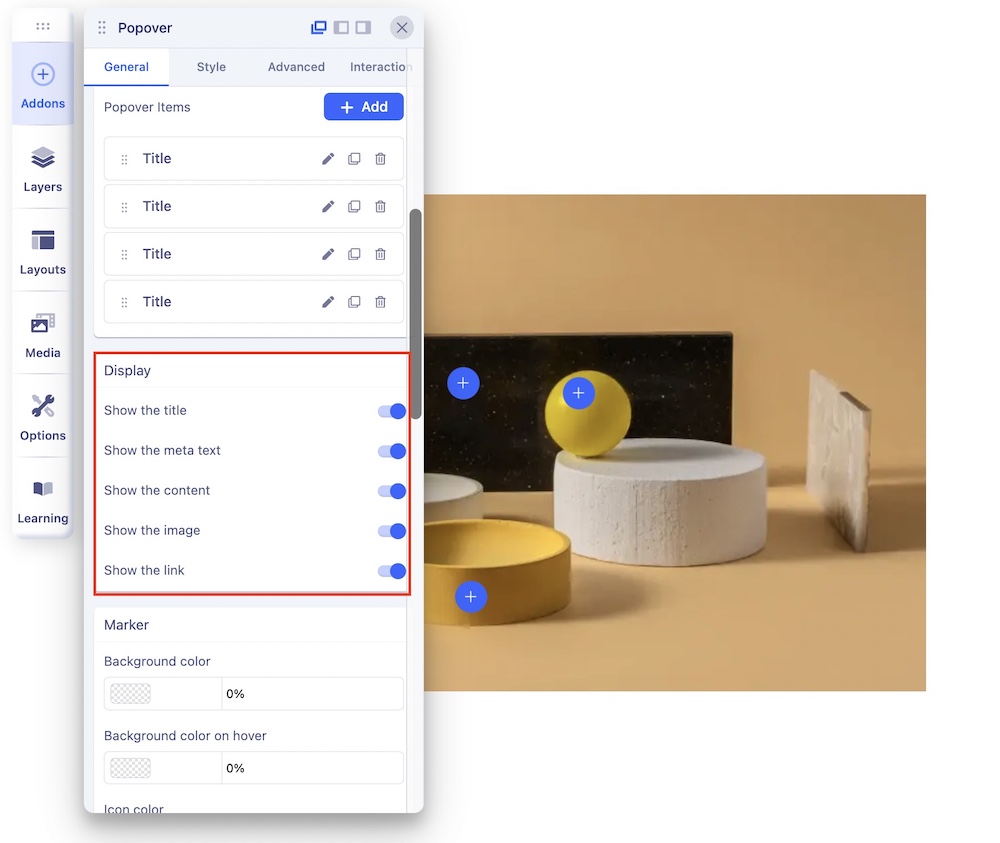 You can set the color, typography, padding, and margin for the Popover itself, Popover Title, Popover Meta, Text Content, and Popover Link,