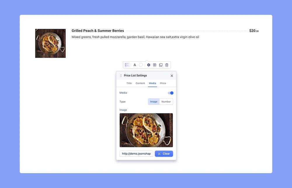 Type: For the Price List addon, the Media can be either an Image or a Number. Select the type you want to add.