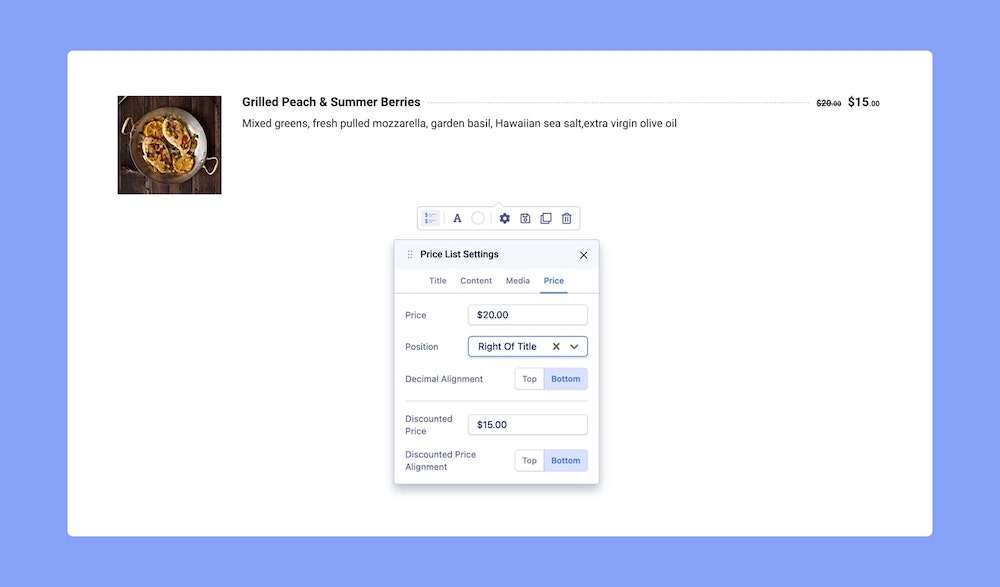 The Price List addon allows you to display the information of a product as a single block. This block consists of the Product's Name (Title), Description (Content), Image (Media), as well as its Price.